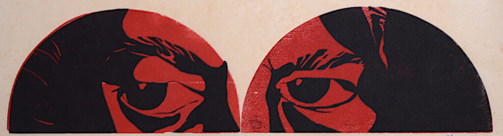 Corruption CorruptionRelief printImage size: 6″ H x 22″ WHand carved, woodblock print in the Japanese tradition on rice paper. This is the only remaining print. Please contact for pricing and details.