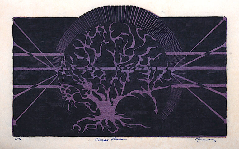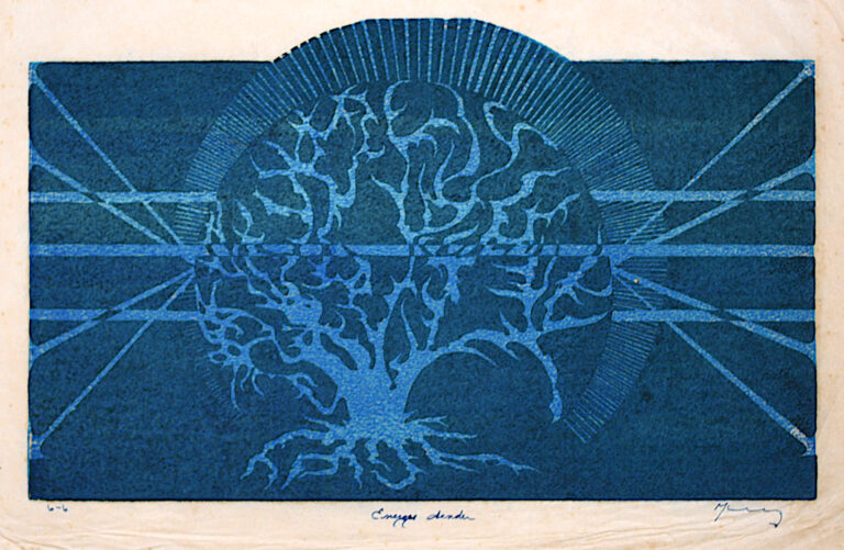 Energy Tree Energy TreeRelief PrintImage size: 11″ H x 18″ WCarved woodblock, multi color print on rice paper in the Japanese tradition. Limited availability. Please contact for pricing and details.