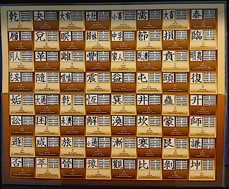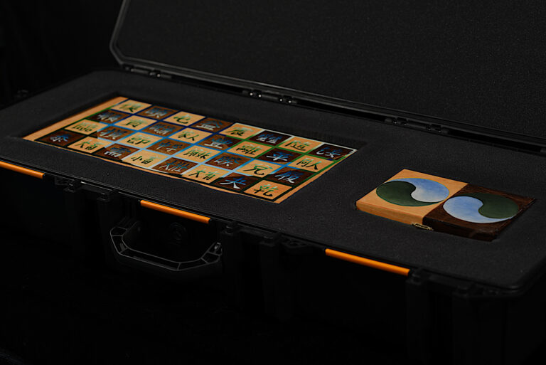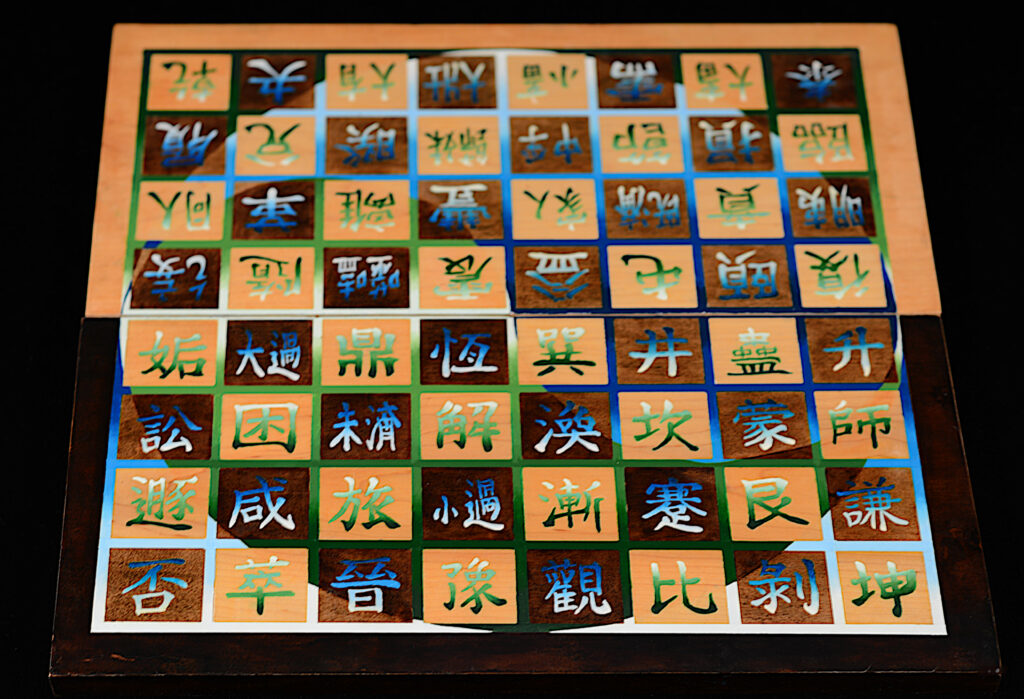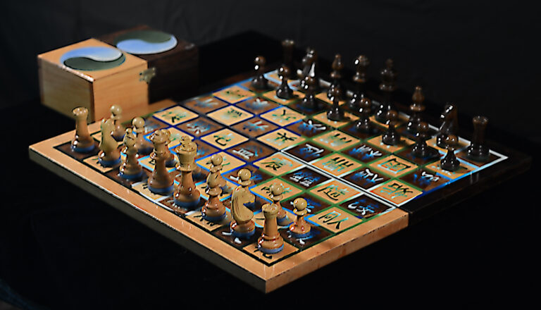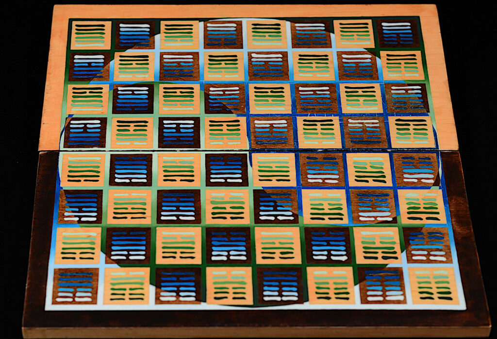 Solid maple, two sided, 19″ H x 19″ W board with barrel hinges for folding. Character and Hexagram sides. Hand stained, oil painted and lacquered.