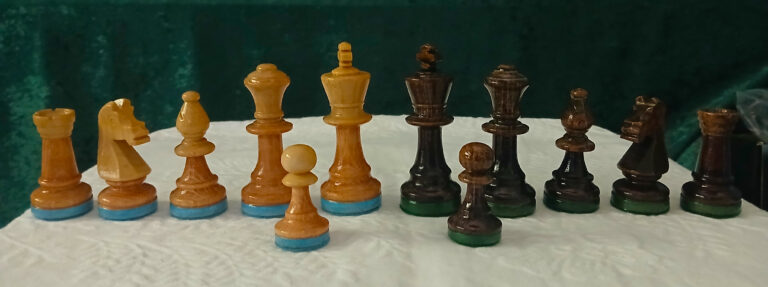 Staunton #5 3 5/8″ weighted, hand stained, oil painted and lacquered pieces with hand painted box.